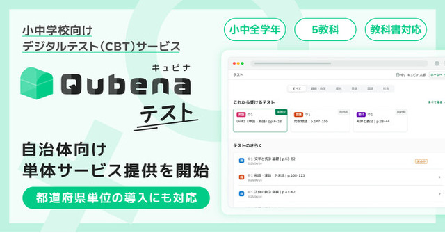 学習eポータル+AI型教材「キュビナ」を開発・提供する株式会社COMPASS(本社:東京都文京区、代表取締役:佐藤 潤、以下 COMPASS)はこのたび、小中学校向けデジタルテスト(CBT)サービス「キュビナ テスト」について、学習eポータル+AI型教材「キュビナ」の導入有無にかかわらずご利用いただける、単体サービスとしての提供を2026年度より開始することをお知らせします。対象は自治体で、都道府県単位での導入も可能です。また、自治体独自の問題搭載への対応も予定しており、「キュビナ テスト」上で自治体の学力調査等を実施いただくことが可能になります。