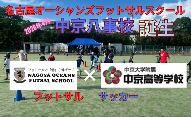 名古屋オーシャンズフットサルスクールは、愛知県の高校サッカー名門校・中京大学附属中京高等学校サッカー部(以下、中京大中京サッカー部)と連携し、中京大学名古屋キャンパスグラウンド(名古屋市昭和区八事本町43)にて「中京八事校」を2026年4月に新規開校します。高校サッカー強豪チームの施設・指導環境を活用したフットサルスクールの開校は、愛知県内初の取り組みです。