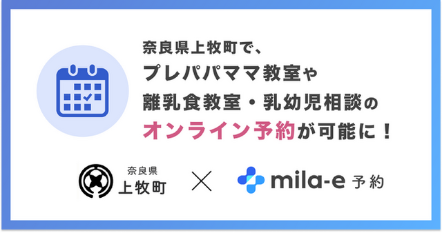 奈良県 上牧町では、妊娠・子育て家庭に寄り添った子育てサービスを提供するため、2023年 10月より ミラボが開発・提供する 母子手帳アプリを導入し、「上牧町 かんまき子育て応援アプリ(*)」として提供しております。今回 同アプリに続いて、オンライン予約「mila-e 予約」を導入する運びとなり、プレパパママ教室・離乳食教室・乳幼児相談を対象に運用を開始しました。