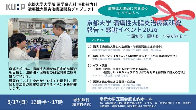 「京都大学 潰瘍性大腸炎治療薬研究 報告・感謝イベント2026」を開催京都大学潰瘍性大腸炎治療薬開発プロジェクトでは、これらの研究の進捗を広く社会に共有し、患者さん・ご家族・支援者の皆さまと直接つながる機会として、以下のイベントを開催いたします。