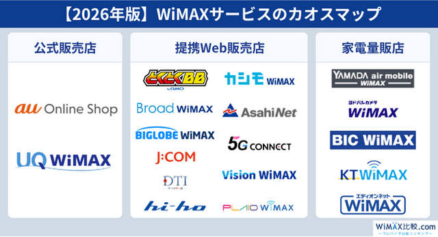 これら3カテゴリは、2026年4月時点におけるWiMAXの主要な販売構造です。UQ公式の「主なWiMAX提供会社」では、WiMAXの申込先として au と UQ の公式窓口が掲載される一方、別枠で「家電量販店のWiMAX」と「Web申し込み/その他WiMAX」が案内されています。