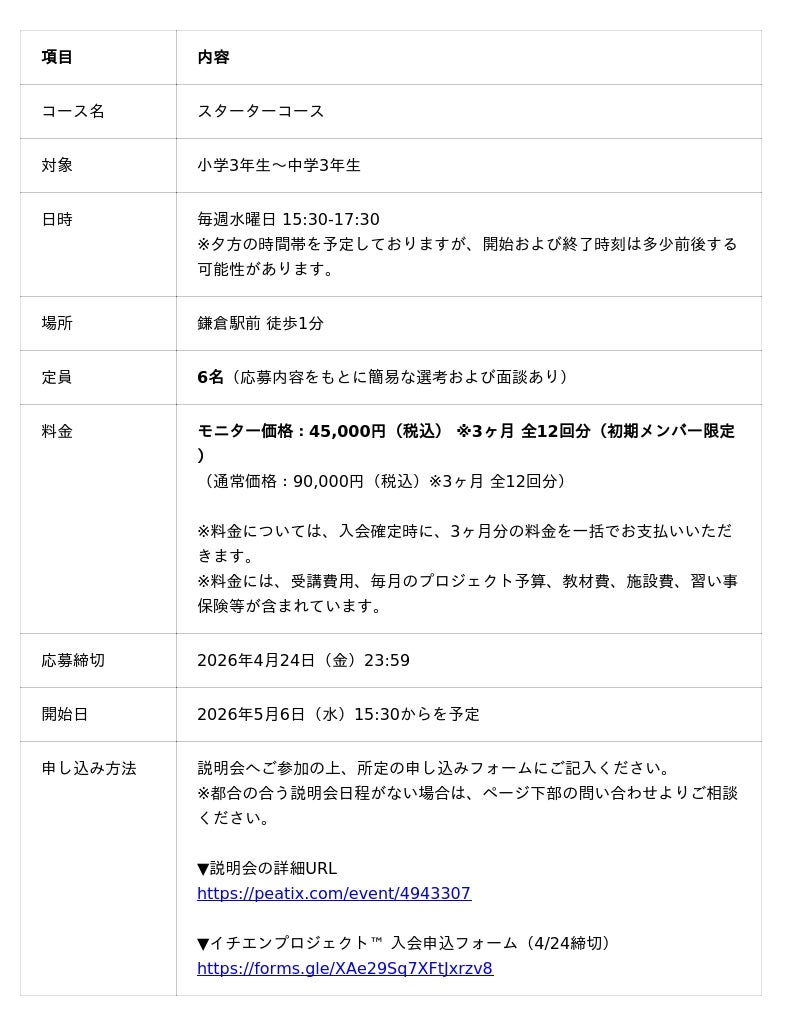 「好きなことで稼ぐ」をリアルに体験する起業教育プログラム「イチエンプロジェクト(TM)︎」2026年5月6日より鎌倉駅前(徒歩1分)にて開講!小・中学生を対象に、鎌倉で仲間と一緒にプロジェクトを進め、思いを形にします。申し込みは4月1日~4月24日まで!現在モニター募集中!