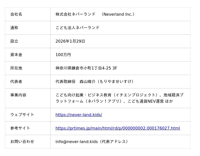 株式会社ネバーランド(所在地:神奈川県鎌倉市、代表取締役:森山晴介)は、小学3年生から中学3年生を対象とした起業・経営実践型の習いごとプログラム「イチエンプロジェクト(TM)︎」を2026年5月6日(水)より鎌倉にて開始いたします。