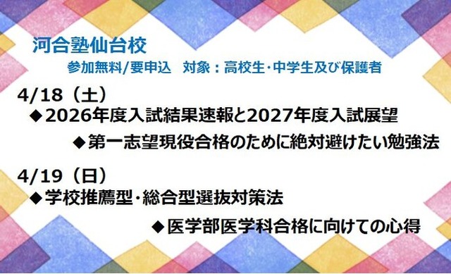 河合塾仙台校は高校生・中学生および保護者を対象に、2026年4月18日(土)と19日(日)に大学受験に関するテーマ別の学習セミナーを開催します。