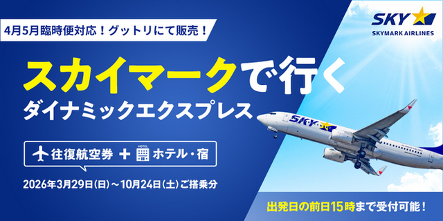 旅行予約サイト『グッドトリップエクスプレス(グットリ)』を運営する日本空輸株式会社(本社:東京都港区、代表取締役:岡下 敏也)は、2026年4月9日より、スカイマーク株式会社(スカイマーク)が2026年4月および5月に運航を決定した「羽田=札幌(新千歳)線」「羽田=福岡線」「羽田=神戸線」の臨時便に対応し、弊社ダイナミックパッケージ(航空券+宿泊)にて販売を開始いたします。