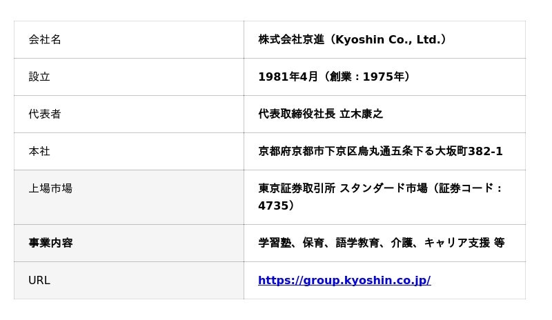 1975年創業。学習塾「TOPΣ(トップシグマ)」「スクール・ワン」のほか、英会話「ユニバーサルキャンパス」、保育「HOPPA」、日本語教育「京進ランゲージアカデミー」、介護「ライフパートナー」など、国内外約500拠点で事業を展開。東証スタンダード市場上場(証券コード:4735)。グループ従業員数約7,000名。