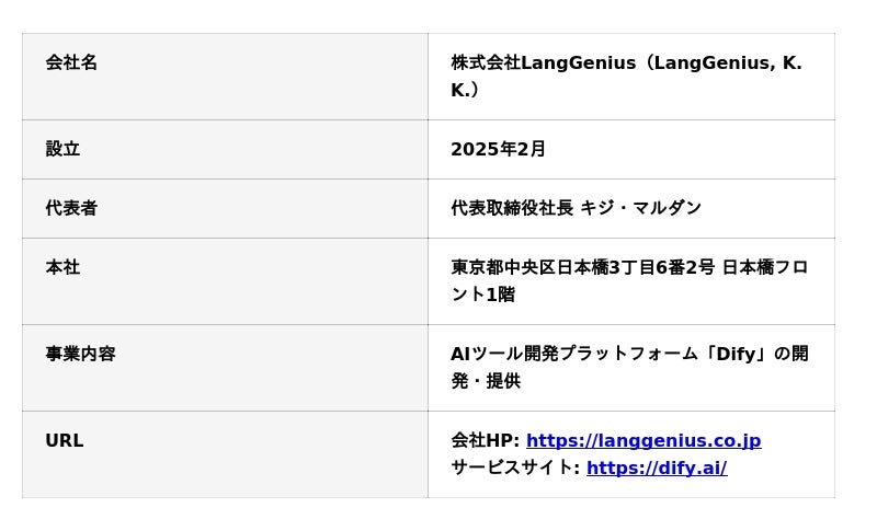「プログラミング不要でAIツールを作れる」プラットフォーム「Dify」を開発・提供。Difyは、150以上の国と地域で利用され、100万以上のAIアプリが開発されているほか、800名以上の開発者が開発に参加しているグローバルサービスです。2025年2月に日本法人を設立し、国内企業、官公庁や行政・教育機関向けのサービスを本格展開しています。