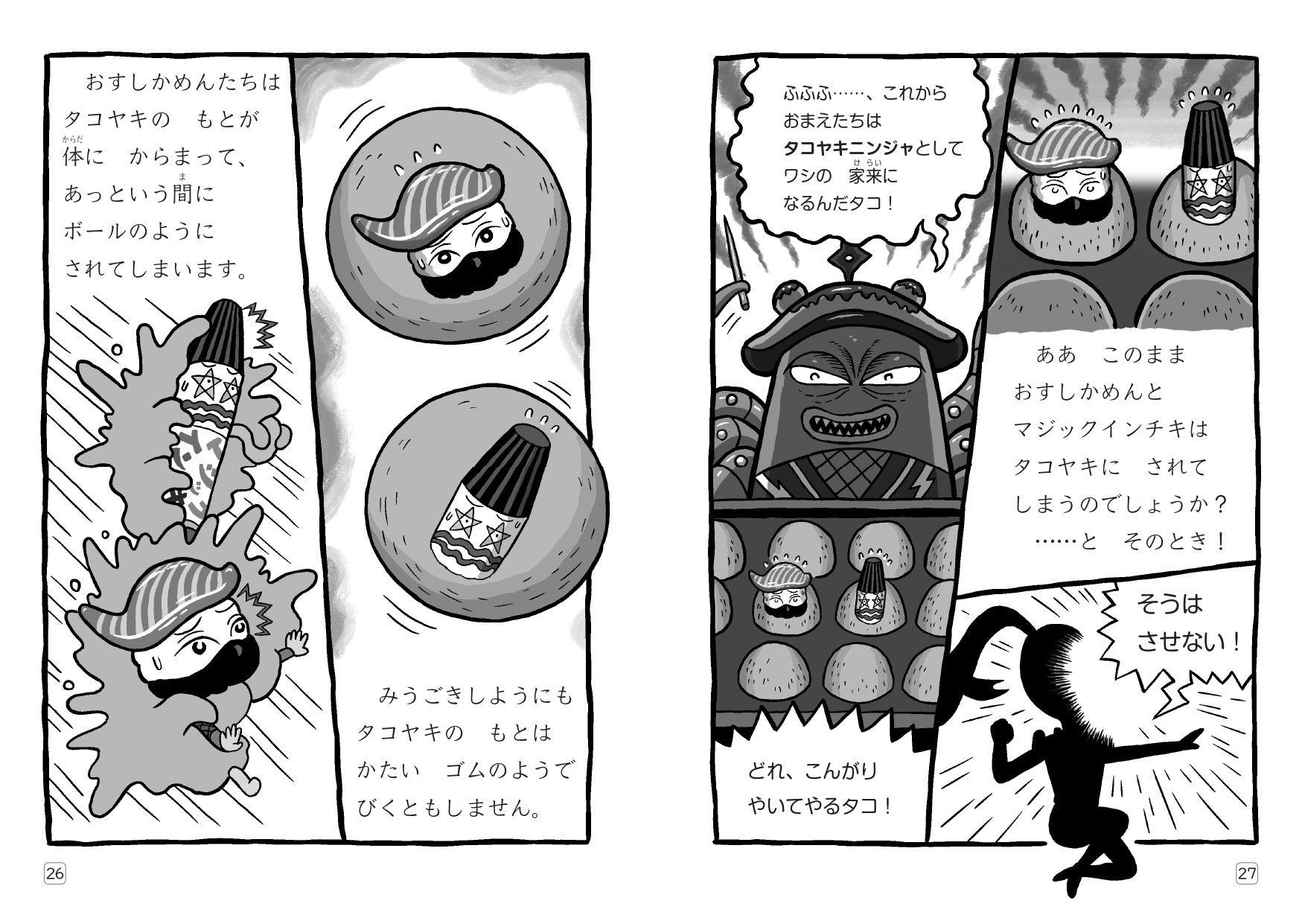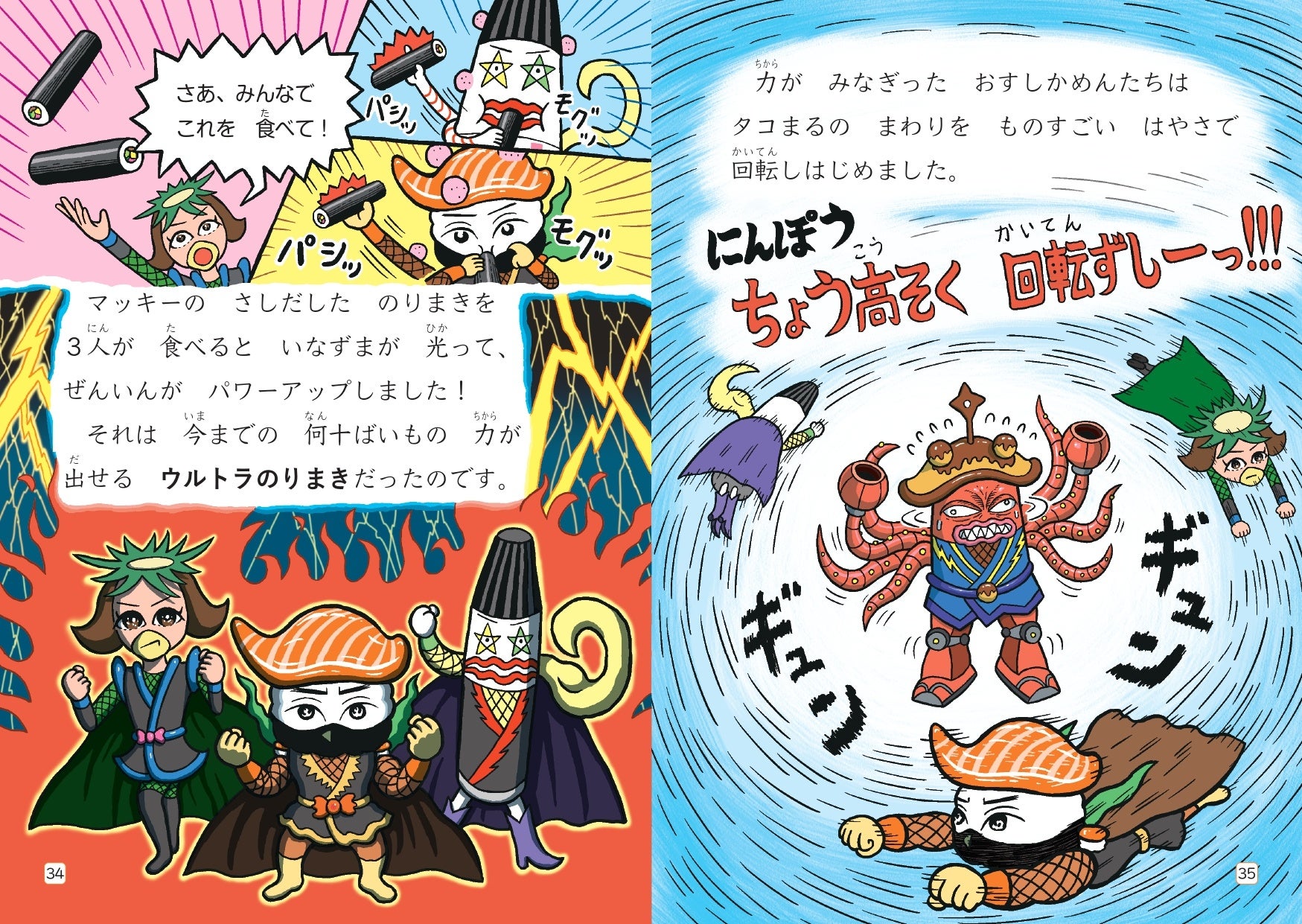 物語のクライマックスでは、おすしかめんとその仲間の全員がパワーアップする「ウルトラのりまき」が登場。「にんぽう ちょう高そく回転ずしーっ!!!」 おすしかめん、マジックインチキ、そしてマッキーの3人が力を合わせて放つ必殺技は、迫力満点です。[画像6: https://prcdn.freetls.fastly.net/release_image/2535/8879/2535-8879-33c83114eb42705f14ebb647739b53c6-1749x1241.jpg?width=536&quality=85%2C75&format=jpeg&auto=webp&fit=bounds&bg-color=fff ]