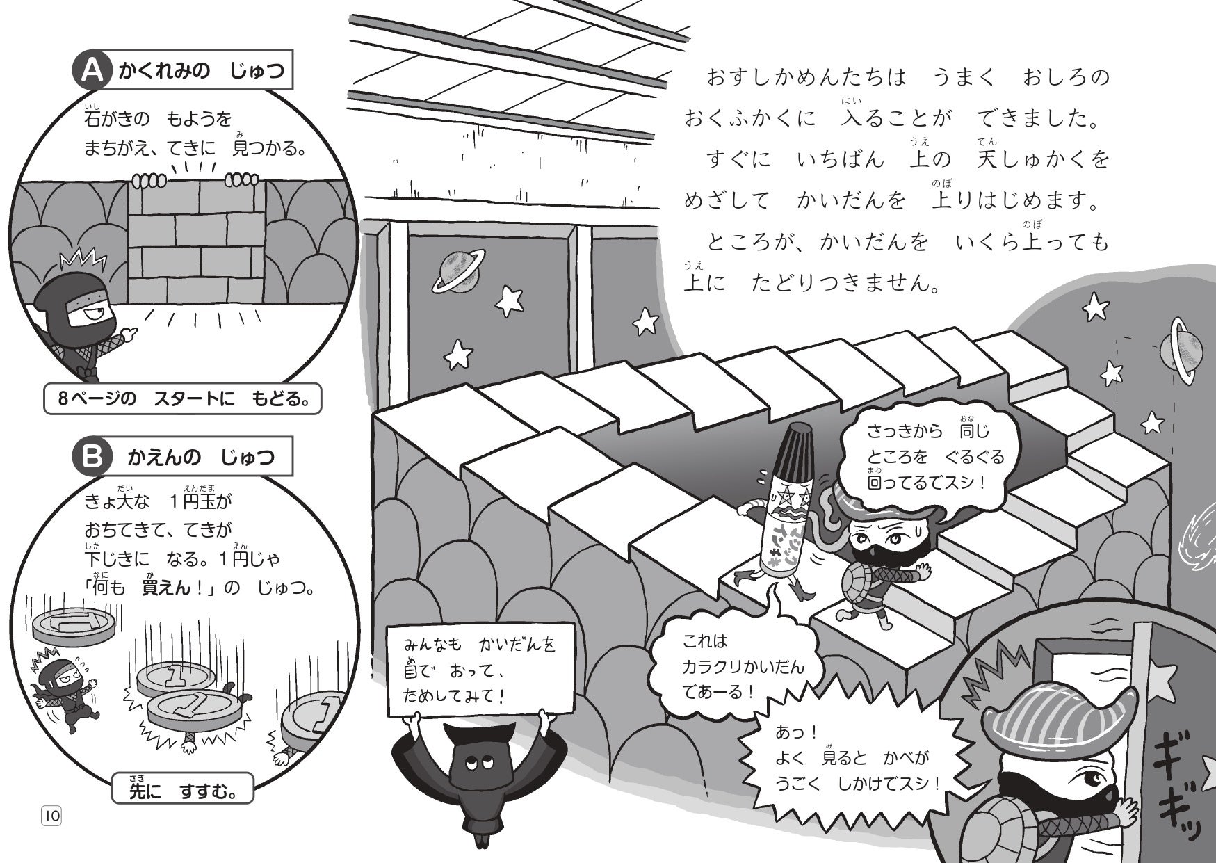 本作には、子どもが夢中になる仕掛けが盛りだくさんです。●カラクリじょうの迷路:敵に見つからないように進む「かくれみのじゅつ」!