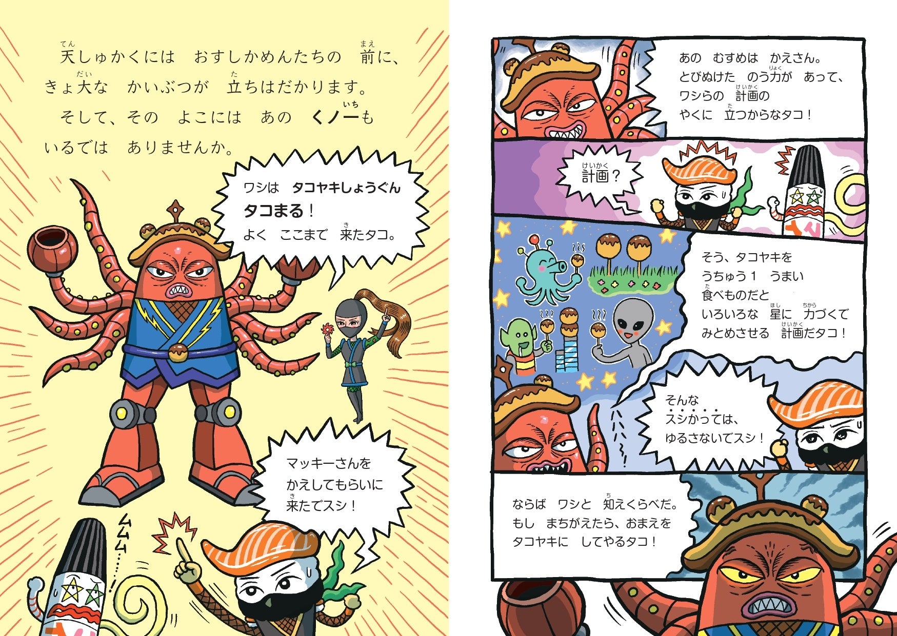 正義のヒーロー・おすしかめんの前に立ちはだかるのは、なぞの「うちゅうニンジャぐんだん」。今回の最終決戦の舞台は、ワナだらけの「カラクリじょう」です。ボスとして現れたのは、巨大な「タコヤキしょうぐん」! 彼はなんと、宇宙中の人々に力ずくで「タコヤキが一番うまい」と認めさせる計画を立てていました。このピンチに、おすしかめんはどう立ち向かうのでしょうか?[画像2: https://prcdn.freetls.fastly.net/release_image/2535/8879/2535-8879-95163b28b4617a3f453c5ed638e1b965-1749x1241.jpg?width=536&quality=85%2C75&format=jpeg&auto=webp&fit=bounds&bg-color=fff ]