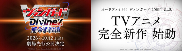 株式会社ブシロード(本社:東京都中野区、代表取締役社長:木谷高明)は、「カードファイト!! ヴァンガード Divinez 運命星戦編」を2026年10月2日(金)より劇場先行公開すること、および2027年に「カードファイト!! ヴァンガード」の15周年を記念した完全新作TVアニメシリーズを始動することをお知らせいたします。