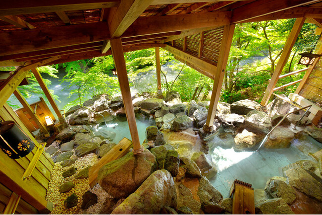 加賀・山中温泉「かがり吉祥亭」真横に渓流が流れる温泉大浴場の露天風呂