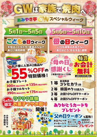 今年のゴールデンウィークと母の日は、ぜひご家族であみやき亭へお越しください。