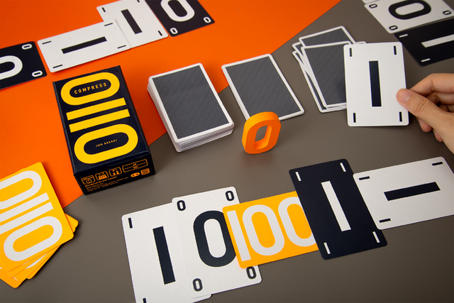 『コンプレス』は、どんどん増えていくカードの並びを、たった8枚の手札で「メモ」していきながら答えていくゲーム。カードの種類はたったの4種類。それも、数字の0か1が、白地か黒地のカードに印刷されたシンプルなカードです。手札から場にカードを出して、新たにカードを手札に補充していくので、メモ用のカードは更新されていく。