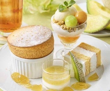 焦がしバターのミニスフレ(3種よりお好みの1品をお選びいただけます)、メロンとジャスミンティーゼリーのショートケーキ、メロンのミニパフェ、お好みの紅茶1品
