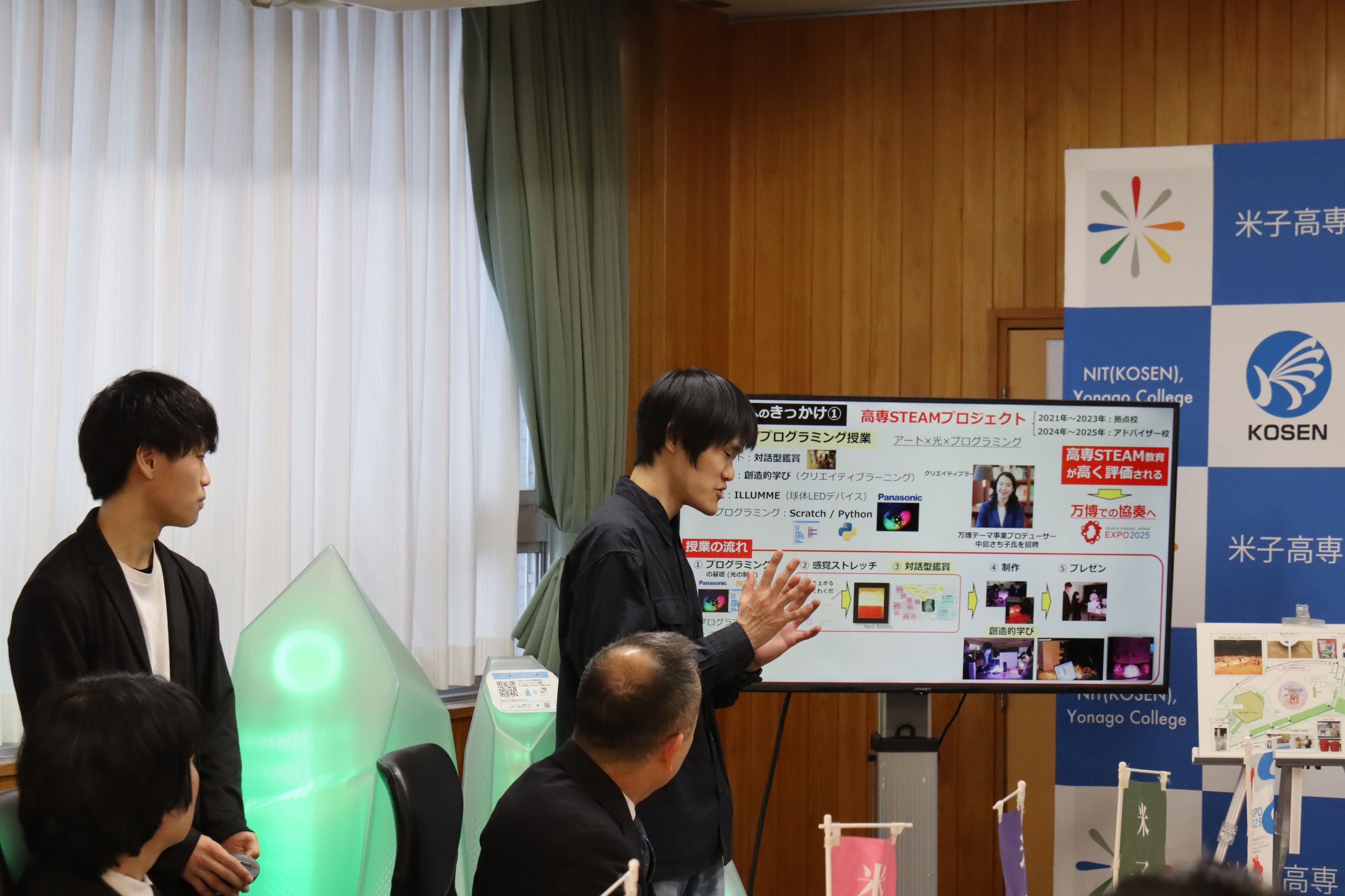これまで、米子高専は創造力を兼ね備えた理系人材を育む“高専STEAM教育”を全国に広めるため、全国高専の拠点校・アドバイザー校として2021年から活動を続けてきました。その活動を通して、アート型プログラミングという新しいプログラミング教育の普及に尽力し、創造的なエンジニアの養成に取り組んできました。今回、2025年大阪・関西万博パナソニックグループパビリオン「ノモの国」でのライトアップ演出や万博レガシー展示では、この高専STEAM教育で培われた学生の創造力と技術力が存分に発揮された形となりました。本企画に携わった学生は「企業の大きなプロジェクトに参加させてもらい、自分たちのアイデアを実現する良い経験になりました」「いろんな人を巻き込んだプロジェクトに参加できてよかった」と話しており、高専STEAM教育の深化が、学生達を大きく成長させ得ることが証明されました。