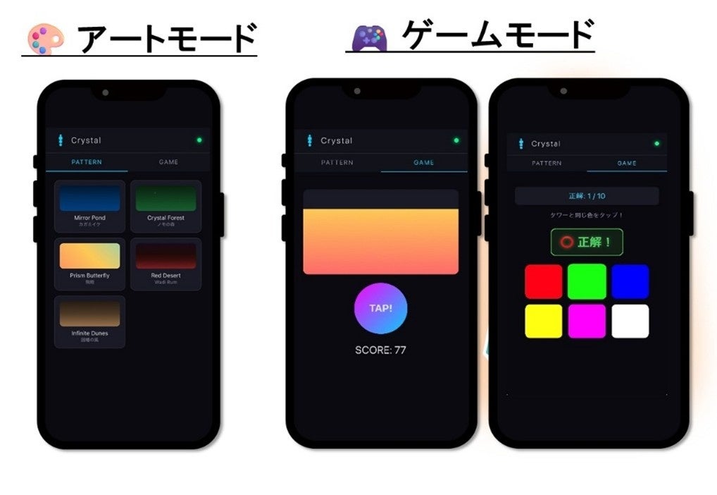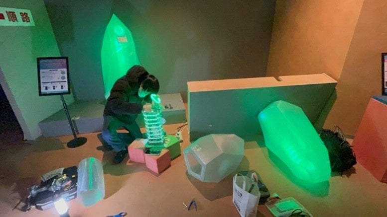 寄贈された万博レガシーは、米子高専の学生達により独自の改造が施され、プログラミングが可能な光デバイスとして生まれ変わりました。そして、万博会場とは異なる展示スペース・数量・表現方法での展示ができるように、連動させる岩什器の数や光り方のパターンをプログラミングにより変更可能にしました。特に、岩什器内に組み込まれているLEDテープの光り方については、展示先の一つである“大阪・関西万博記念 サンドパビリオン”に関連した演出を組み込むなど工夫を凝らしました。また、来場者が自分のスマートフォンを使って万博レガシーの光演出をゲーム感覚で制御できるアプリも開発し、新機能としてデバイスに追加しました。このように米子高専の学生達が主体となって新たな演出を考案し、プログラミングやハードウェアの再構成を行うことで「ノモの国」万博レガシーの新しい利活用方法を創成することができました。