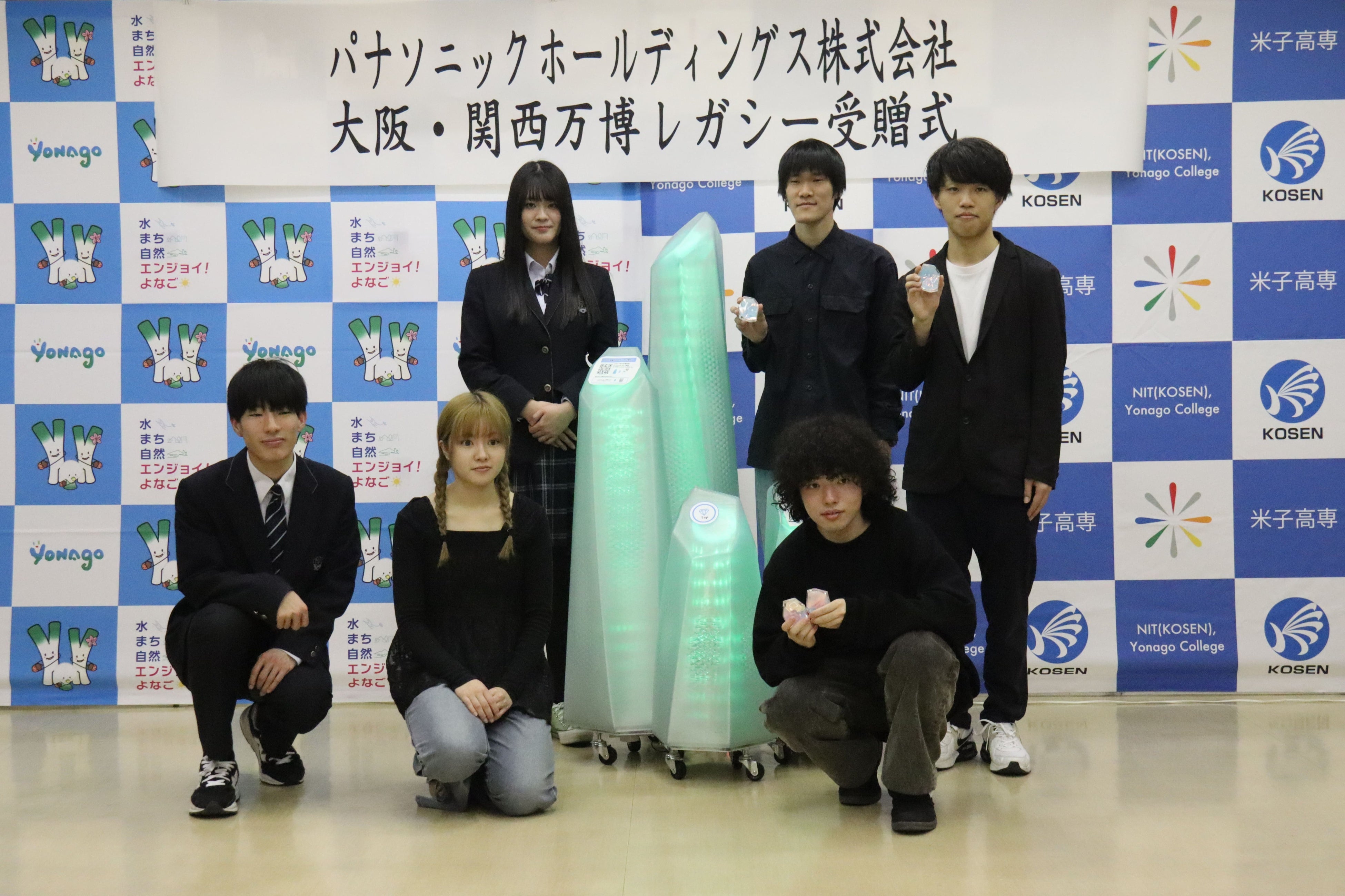 米子市との合同寄贈式で万博レガシーと共に写る学生達