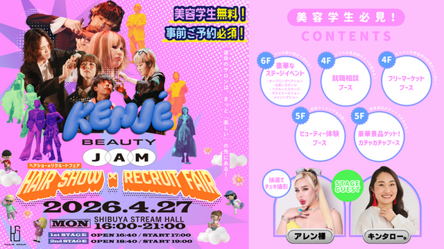 株式会社ケンジ(本社:神奈川県藤沢市、代表:田坂 公一)は、2026 年 4 月 27 日(月)渋谷ストリームホールにて今年で三回目となる美容学生向けリクルートイベント「KENJE BEAUTY JAM」を無料開催いたします。 このイベントは、美容業界のトレンドや、業界の動向を美容学生や美容学校の先生に直接体感してもらいたいという想いから企画。