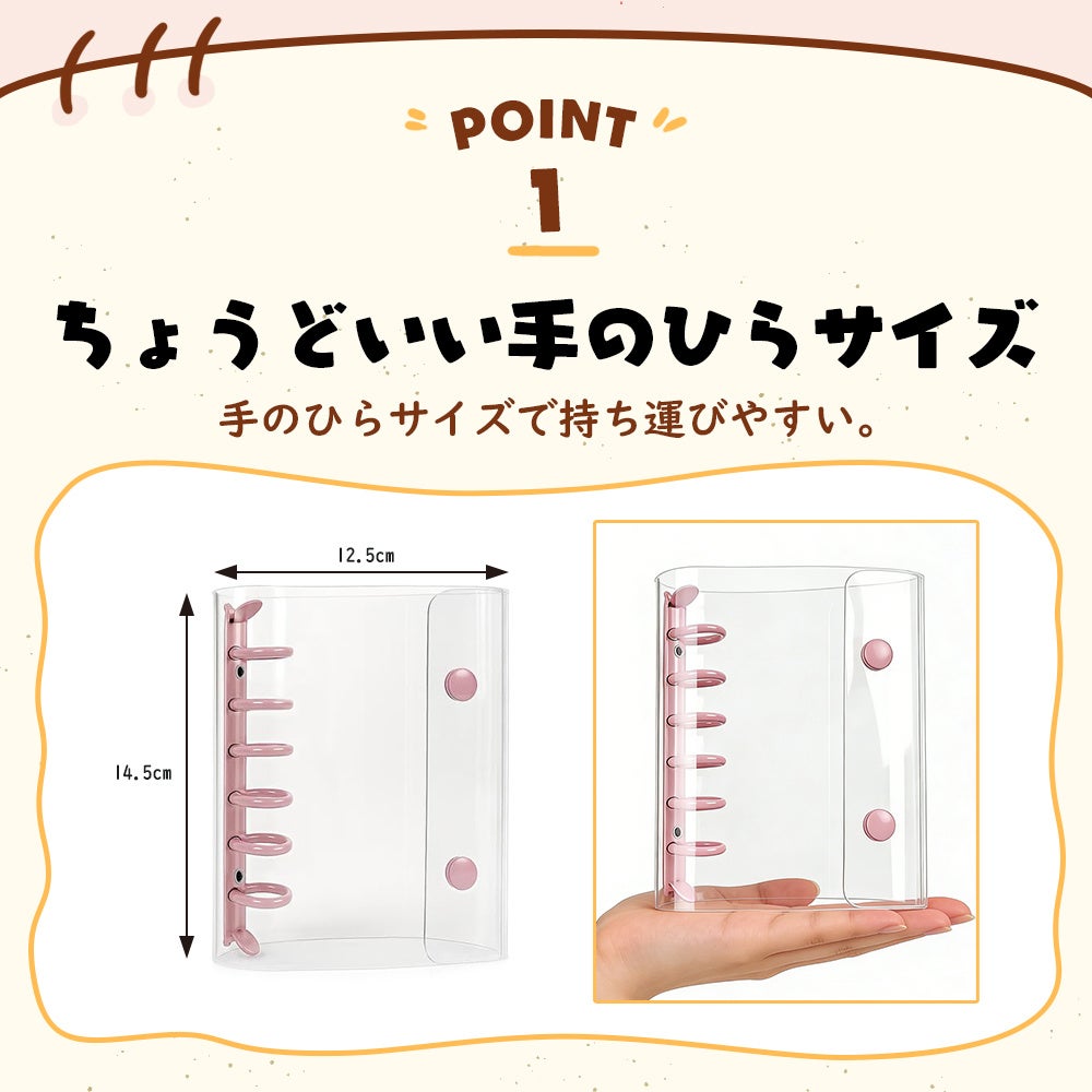 パステル調のやさしい色のバインダーと高透明デザインの組み合わせ。バインダーは3色ご用意。