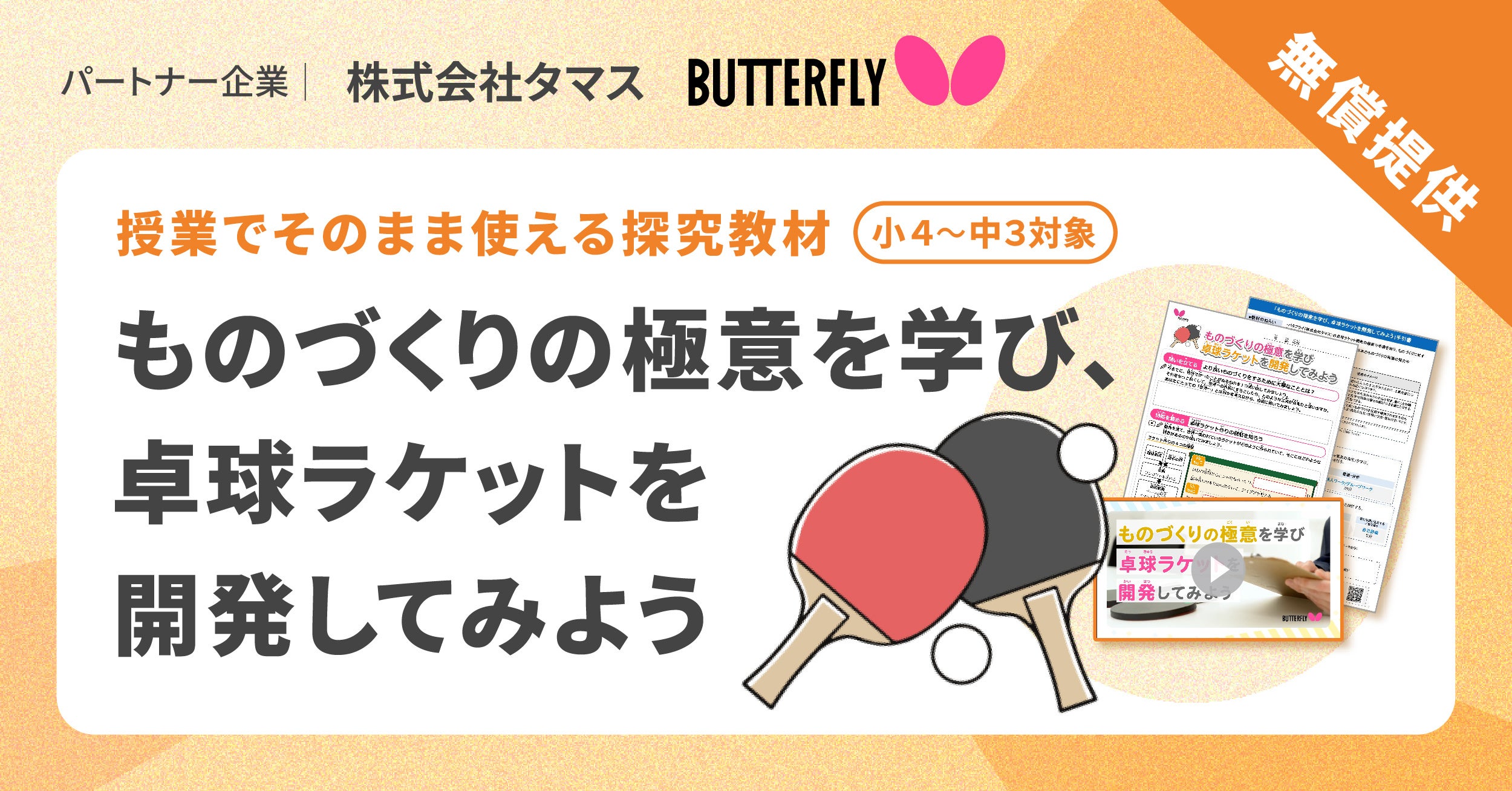 「バタフライ」ブランドを展開する株式会社タマスは、株式会社小学館集英社プロダクション(代表取締役社長:松井聡 東京都千代田区)、株式会社COMPASS(代表取締役:佐藤潤 東京都文京区)と共同し、小・中学校向け探究学習ライブラリー「SPARKE(スパーク)」で利用可能な探究学習プログラム「ものづくりの極意を学び、卓球ラケットを開発してみよう」を提供します。