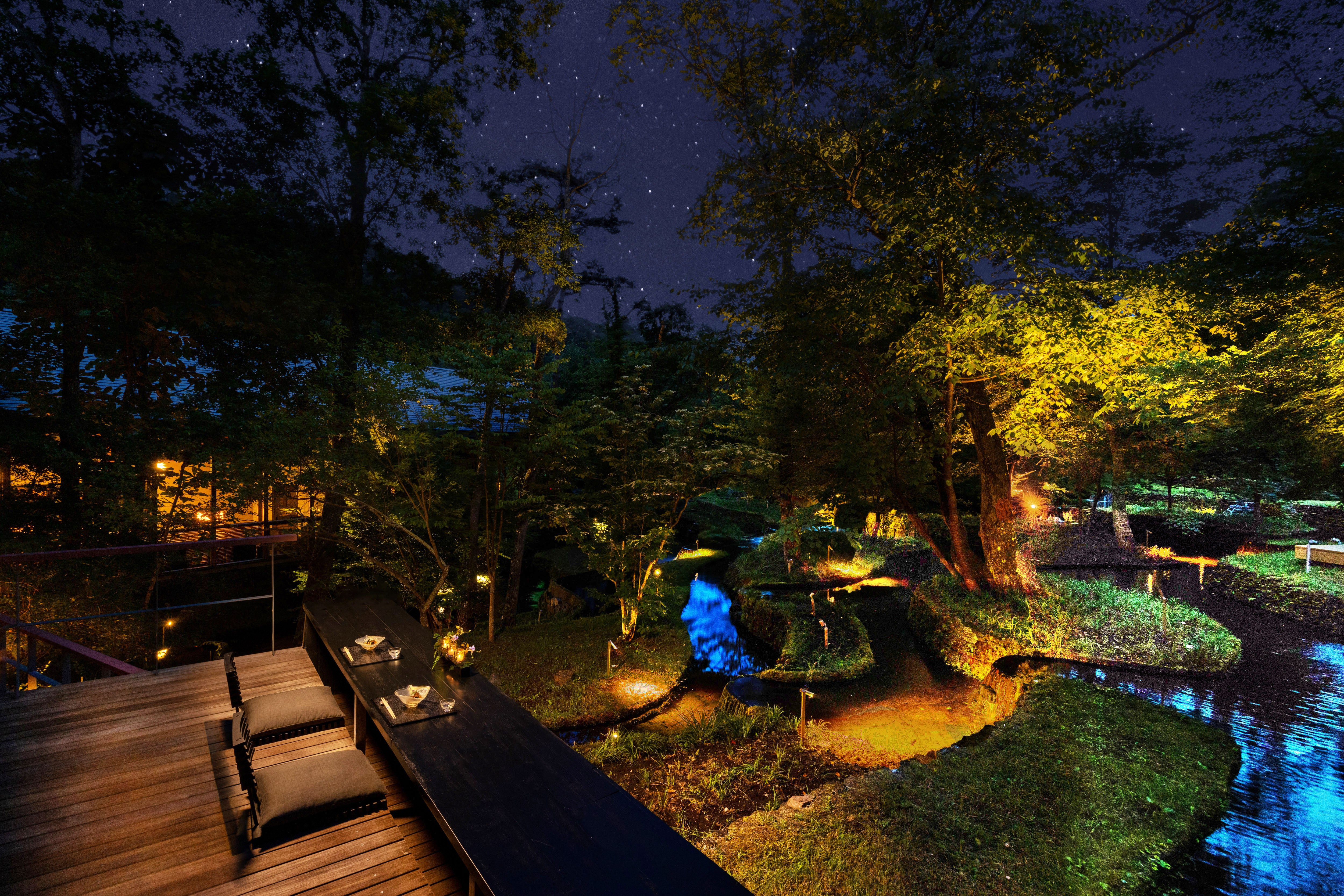 浅間山の麓に広がる谷あいの地形と豊かな自然に抱かれ、陰翳礼賛の考えに基づいた静謐なランドスケープが広がる星のや軽井沢。そんな宿の近くを流れる清らかな小川のほとりには、夏の限られた期間、無数の蛍が放つ幻想的な灯りが辺りを優しく包み込みます。せせらぎの音や草木の香り、そして目に映る闇夜に浮かぶ蛍の光。日本の原風景を静かに思い起こさせる、心安らぐひとときを過ごせます。