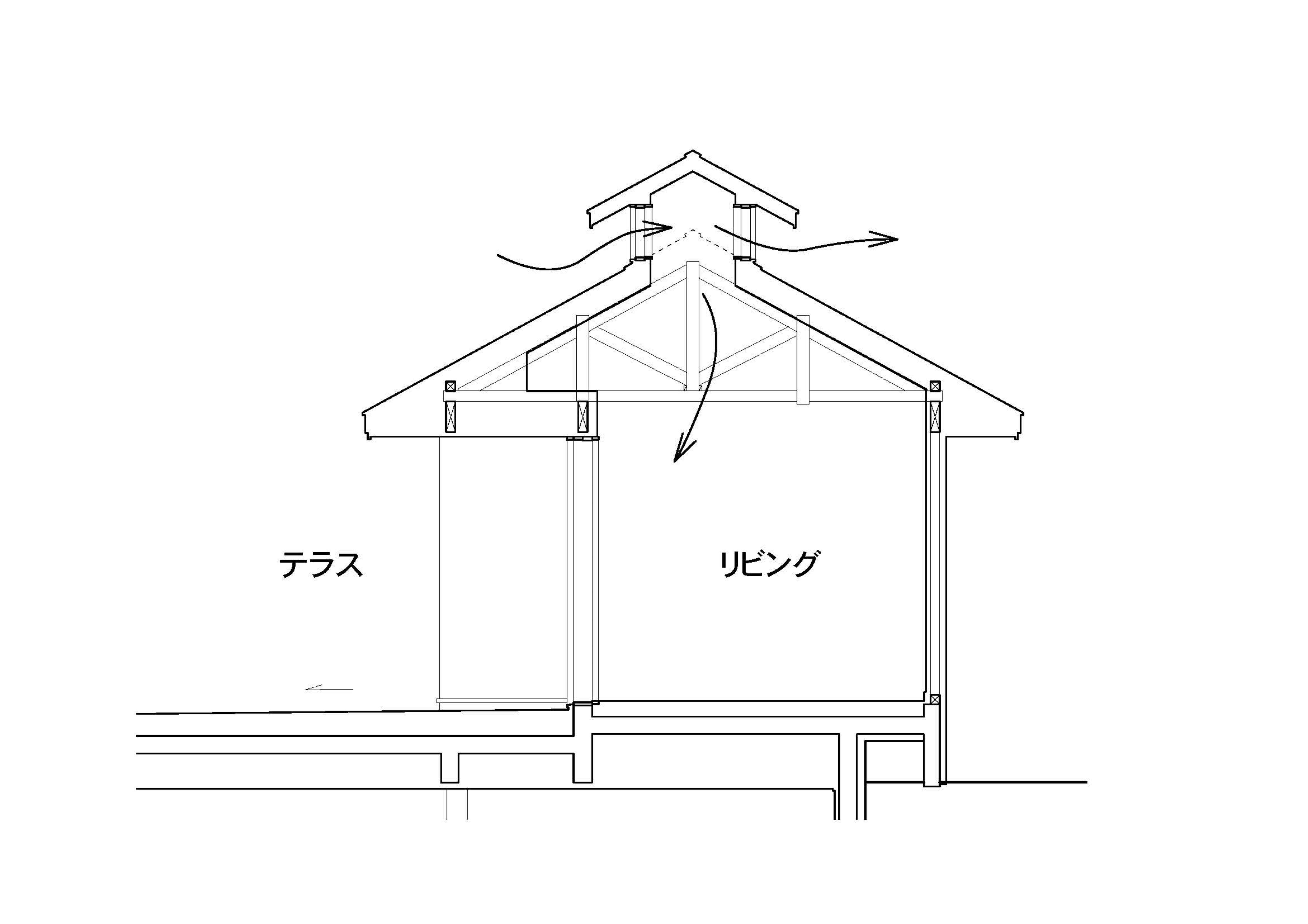 星のや軽井沢の客室には、屋根の上に「風楼(ふうろう)」と呼ばれる小屋根を設けています。これは天井部から外気を取り込む通気口の役割を担うもので、温まった空気を排出し、冷涼な外気を呼び込むことで室内の空気循環を促す仕組みです。自然の風の流れを活かして室温を調整する「天然のエアコン」としての機能を備え、空調設備に過度に頼ることなく、心地よい空間を維持することを目指した建築設計です。