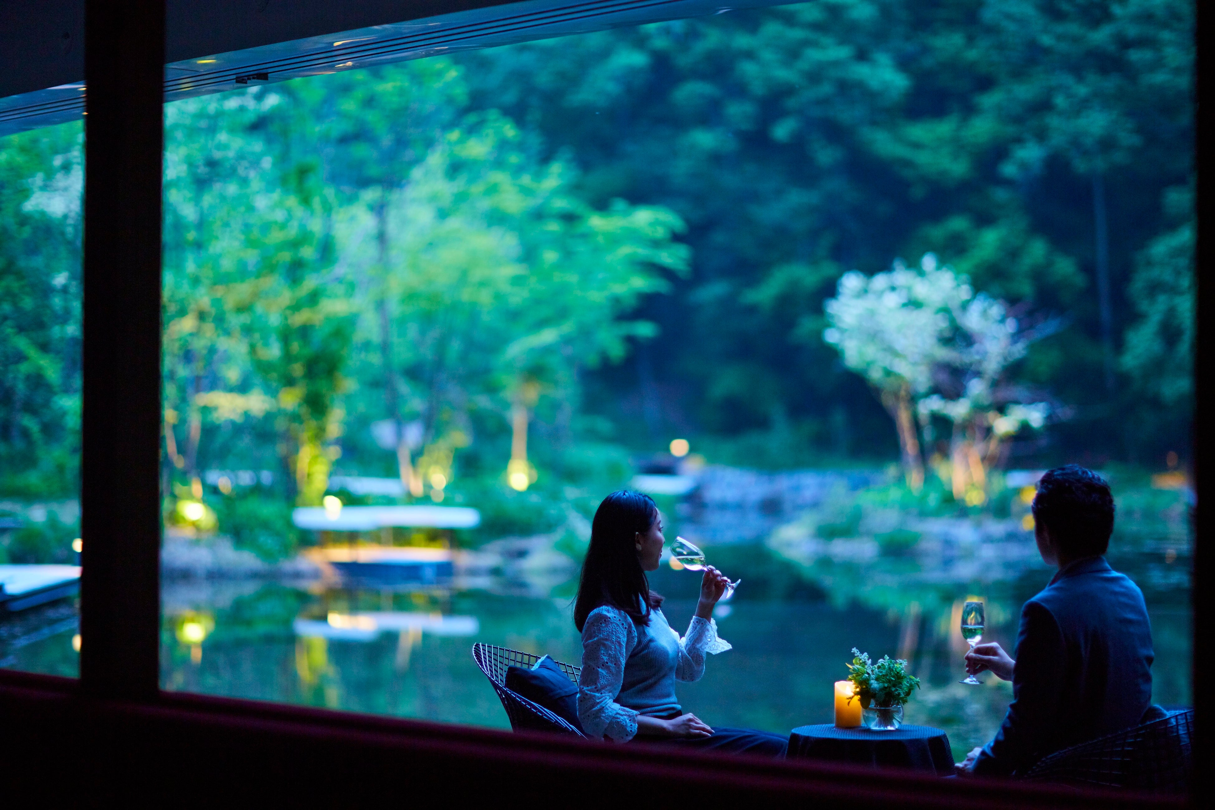 静謐な森に佇む「森のほとりCafe&Bar」を一日一組限定で貸し切る記念日プランを提供します。幻想的な自然の中、大切な人と共にケーキを彩る体験や、伝統工芸品「内山紙(*4)」に想いを綴る体験を通して、共に過ごした時間を記憶に刻むひとときを過ごせます。綴ったメッセージは当日の記念写真と合わせ、オリジナルアルバムとして提供。森の息吹やせせらぎが心地よい非日常空間で、大切な人との絆を深める、至福の夜を過ごすことができるプランです。