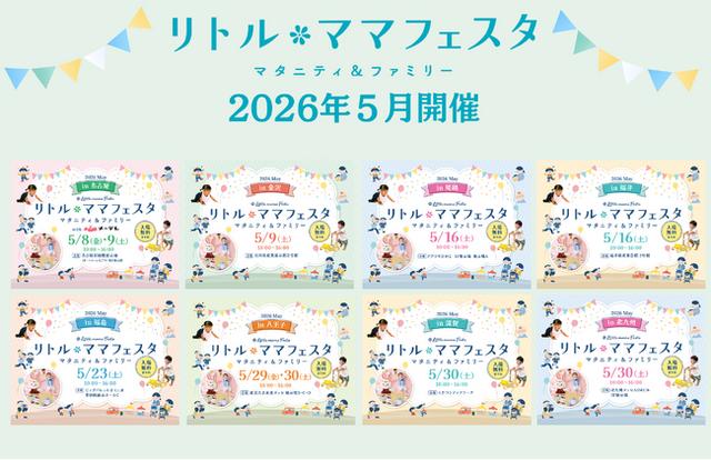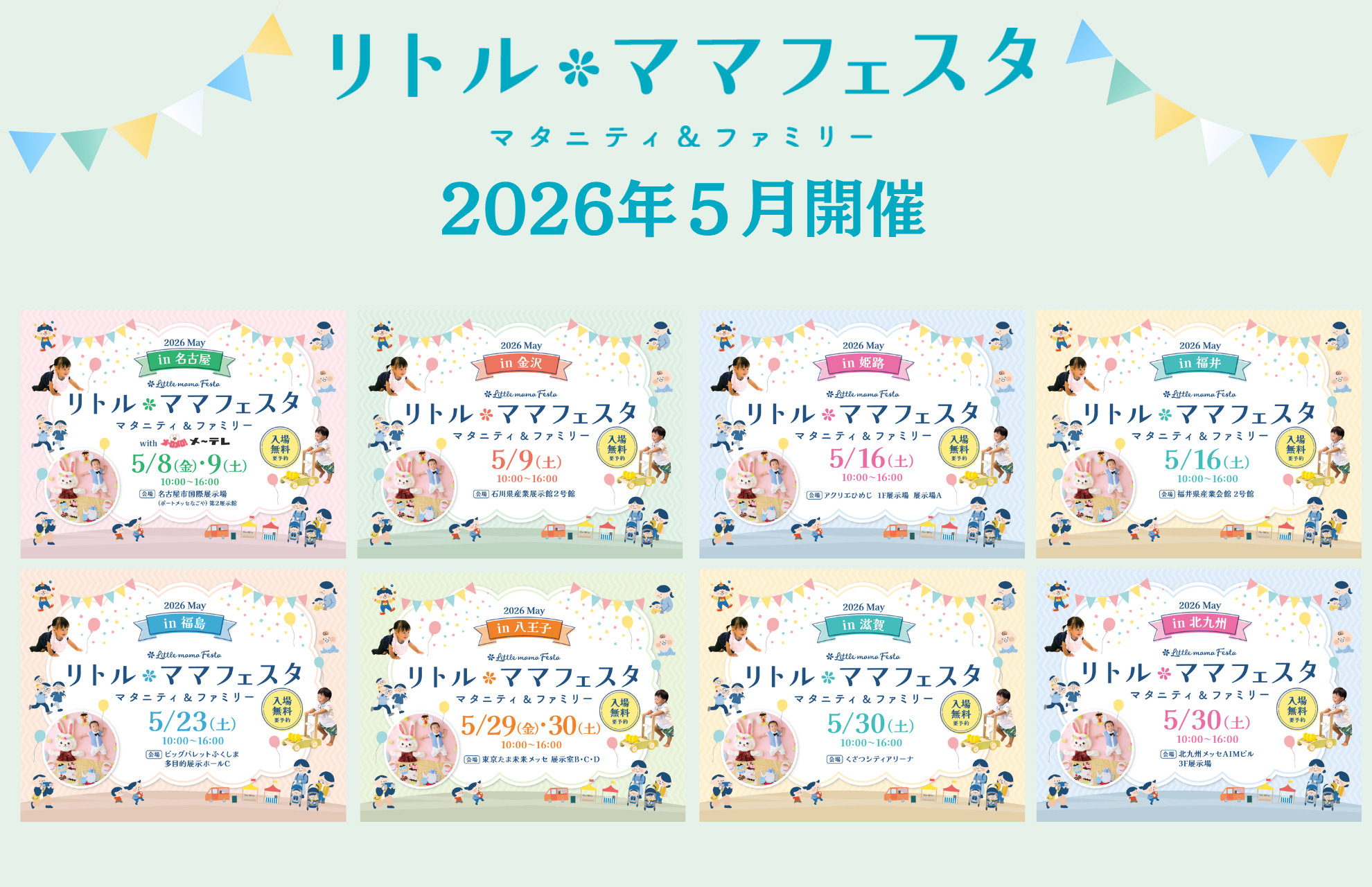 子育て世帯を中心に、親子で楽しめる体験や地域交流への関心が高まるなか、国内最大規模の親子フェスタを開催する株式会社エンファム.(東京本社:東京都港区、福岡本社:福岡県福岡市、代表取締役:森 光太郎)は、5月8日(金)・9日(土)名古屋、5月9日(土)金沢、5月16日(土)福井・姫路、5月23日(土)福島、5月29日(金)・30日(土)八王子、5月30日(土)滋賀・北九州の8都市にて、親子向けイベント「リトル・ママフェスタ」を開催いたします。ママ・パパとお子さまとの『思い出づくりの場』として、ご家族皆様でお楽しみください。
