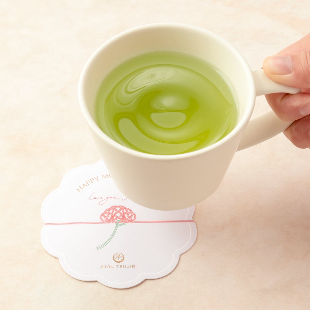 5月10日(日)の「母の日」に向けて、祇園辻利では大切なお母さんに贈る、心安らぐ特別なギフトを全8品ご用意。なお、一部商品には、オリジナル「母の日コースター」をお付けしています。淡い色彩の中に、カーネーションを思わせる優しいタッチと「Love you, Mom」のメッセージを添えた一枚は、言葉では伝えきれない想いをそっと届ける小さな贈りもの。お茶の時間に寄り添いながら、心温まるひとときを彩ります。