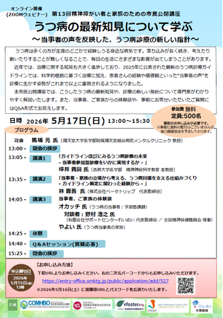本市民公開講座では、こうしたうつ病の最新知見や、診療の新しい指針について専門家がわかりやすく解説いたします。また、当事者、ご家族からの 体験談や、事前にお寄せいただいたご質問にはQ&A形式でお答えします。
