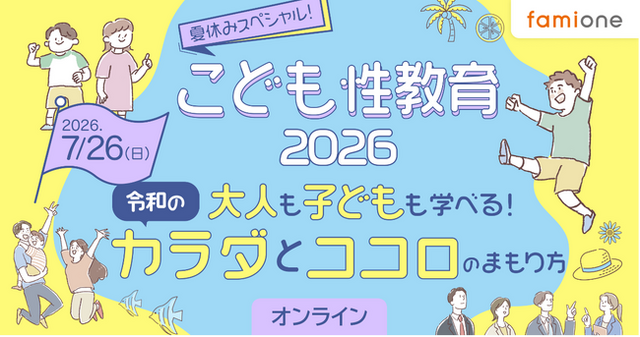 「子どもを願うすべての人によりそい 幸せな人生を歩める社会をつくる」をビジョンに掲げ、法人の従業員向け福利厚生や自治体の住民向け支援を行うヘルスケアサポートサービス「ファミワン」 https://famione.com/benefit/ などを展開する株式会社ファミワン(本社:東京都渋谷区、代表取締役:石川 勇介)は、オンラインイベント、『夏休みスペシャル!こども性教育2026 大人も子どもも学べる!令和の「カラダとココロのまもり方」』を2026年7月26日(日)に開催します。