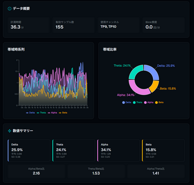 「脳波タイプ診断」は、脳波デバイスで測定した脳波データ(CSVファイル)をアップロードすることで、Delta・Theta・Alpha・Betaの4帯域を分析し、4軸16タイプの思考パターンとして可視化するサービスです。
