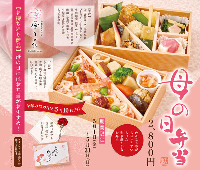 今年の母の日は5月10日(日)。「母の日弁当」のご予約は全国の梅の花レストラン店舗にて受付を