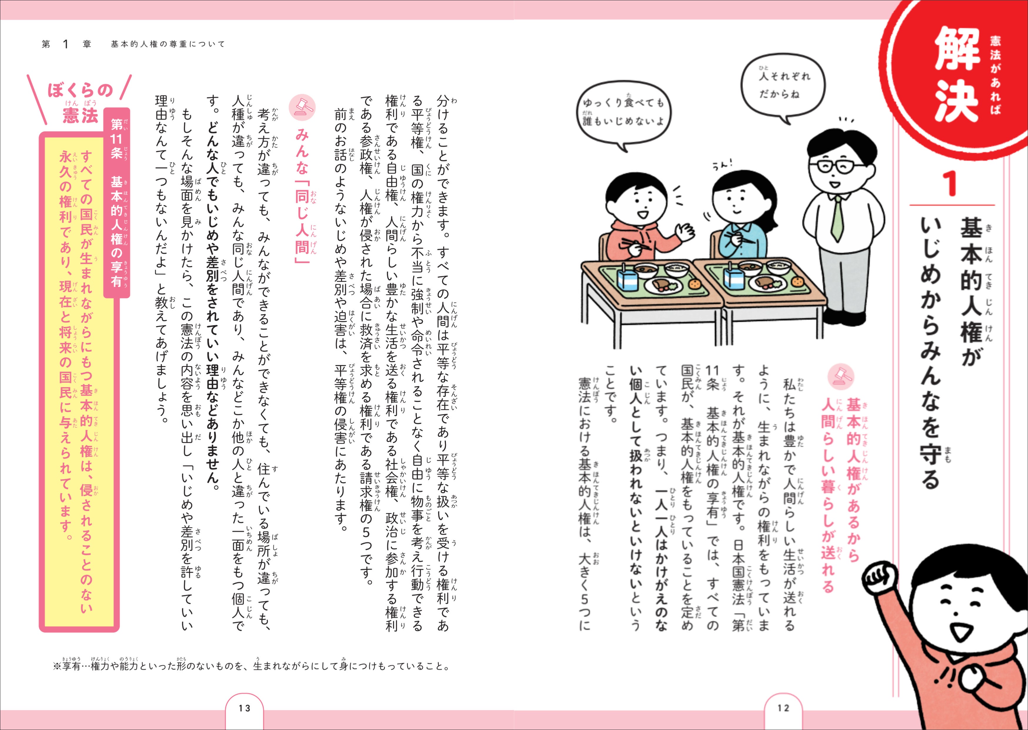 全編にわたって親しみやすいキャラクターとイラストを豊富に掲載。文章を読むのが苦手なお子さまでも、マンガ感覚で憲法の本質や重要性をつかむことができます。さらに、難解な言葉で書かれた憲法の条文を、小学生が理解できるよう平易な表現に調整して記載しています。