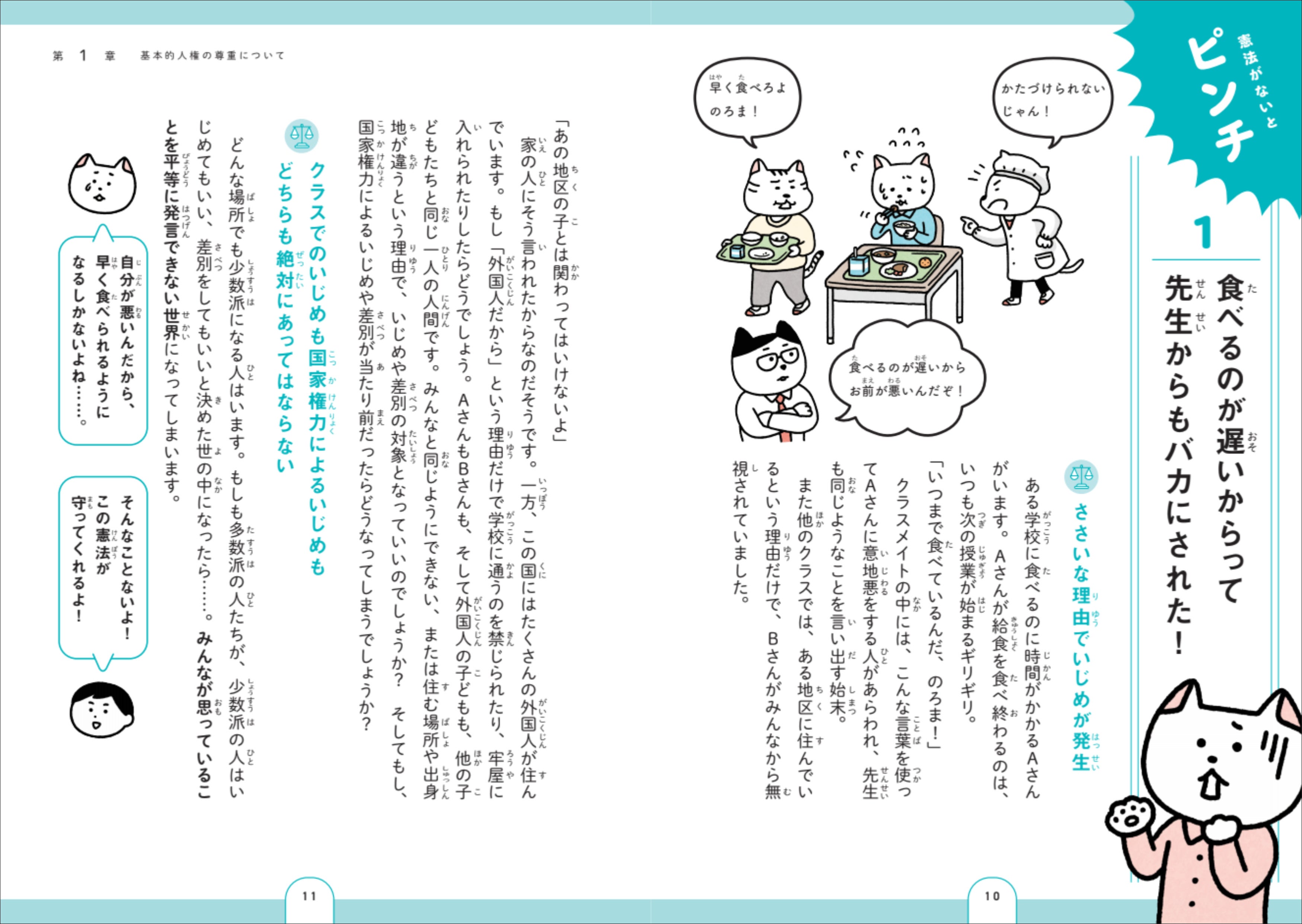 本書は、「基本的人権の尊重」「国民主権」「平和主義」という3テーマで構成され、いじめのような小学生に身近なピンチから、選挙、裁判、戦争などのさまざまなピンチを30紹介しています。