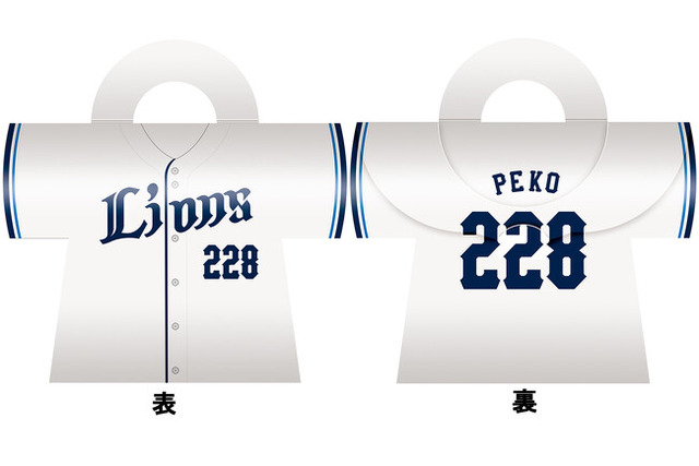 埼玉西武ライオンズのユニフォームデザインがギフトボックスに! 中には不二家のお菓子を詰め合わせました。ペコちゃん風に舌を出した埼玉西武ライオンズの選手たちが描かれたステッカー(全12種)がランダムで1枚封入されています。