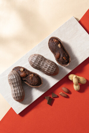 落花生の甘煮とチョコレートを合わせた餡を、ココアパウダーを練り込んだ最中種で挟みました。餡は、なめらかでコクのある味わいです。チョコレートの存在感をしっかり楽しみながら、後からぴーなっつのやさしい風味が重なります。最中種にはココアパウダーを練り込み、香ばしい風味に仕上げました。