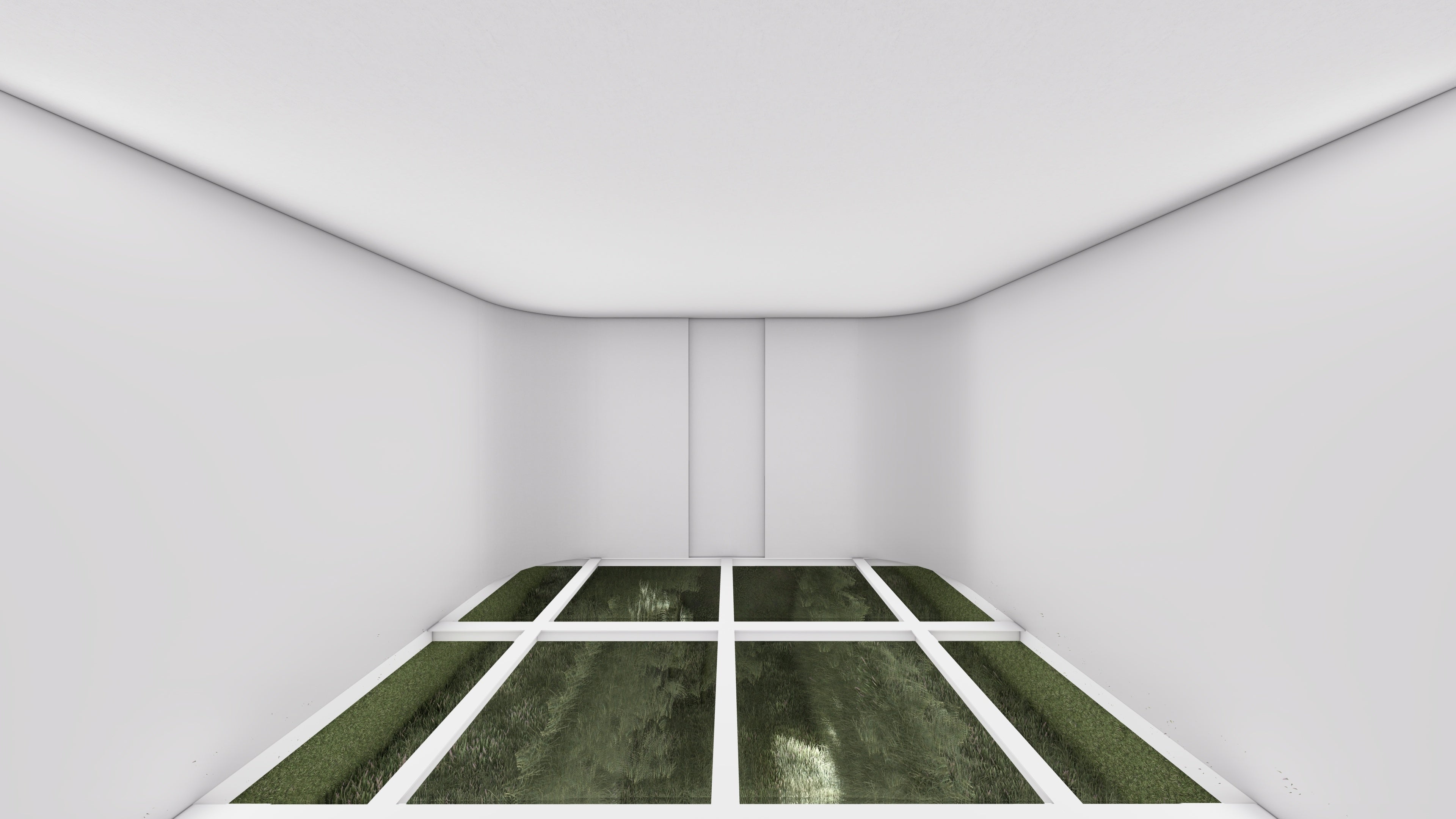 そこから階段を下り、1階の室Bへと進むと、床一面に広がるガラス越しに、半地下に設えられた庭が現れます。1階の室Bは、その半地下空間を“奥庭”として見立てて構成されており、床下に広がる庭と連続することで、視線はさらに奥へと導かれていきます。視覚的な広がりとともに、空間は次第に内側へと閉じ、見るという行為から、感じるという体験へと移行していきます。