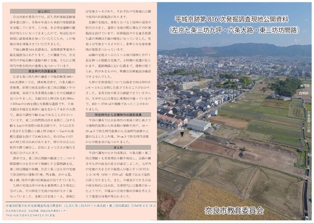 奈良市教育委員会では、令和6年度から西九条佐保線道路建設事業に伴い、事前の発掘調査を実施しています。事業地の最北端、平城京跡第816次発掘調査(調査地1‐2)では、平城京の道路跡(六条大路・東三坊坊間路)や平城京左京七条三坊九坪の宅地跡事業地の最南端、平城京跡第814次発掘調査(調査地6)では平城京の道路跡(東三坊坊間路)や平城京左京八条三坊七・十坪の宅地跡とともに弥生時代の墓跡(方形周溝墓)等が確認されました。つきましては、この発掘調査成果を地元住民のみなさまにご覧いただく為に、下記の日程で発掘調査現場2か所の現地公開を行いました。