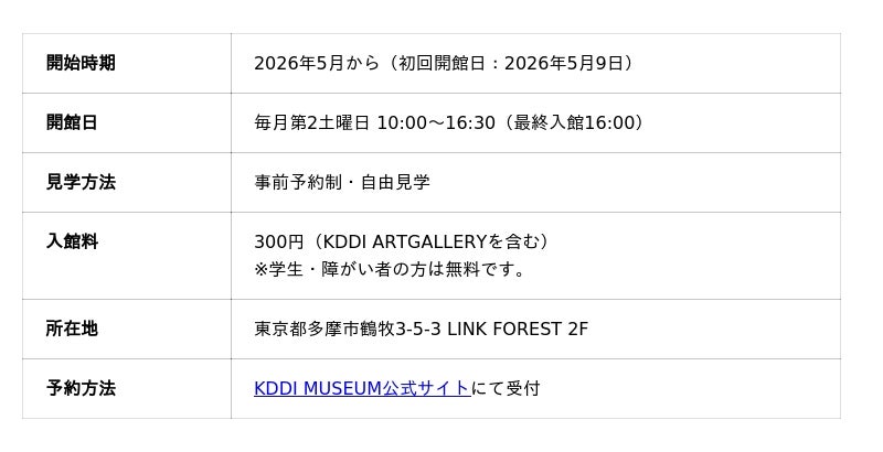 [表: https://prtimes.jp/data/corp/97141/table/188_1_e7c263e66568e1d3fdadd3de493b155b.jpg?v=202604200216 ]■KDDI MUSEUMの一部展示リニューアルについて