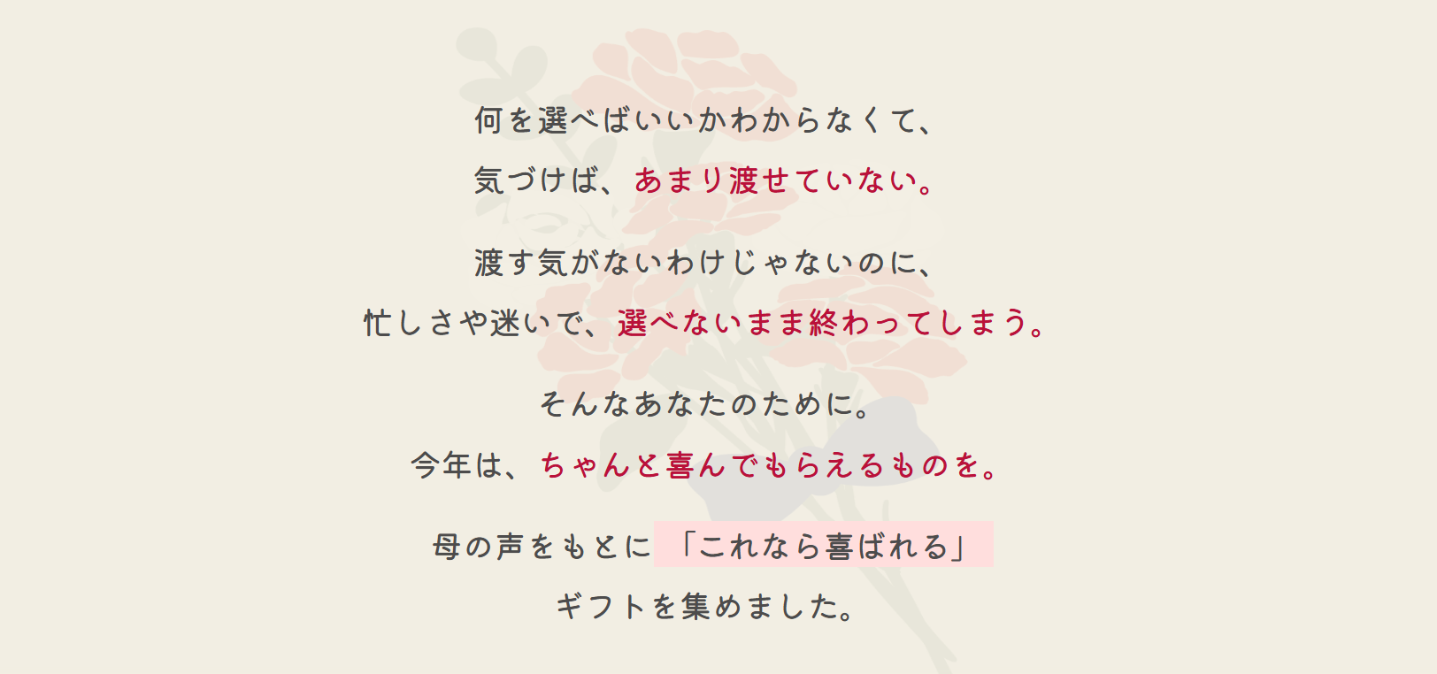 母の日は「気持ちがない」のではなく、「選べないまま過ぎてしまう」人が一定数存在すると考えています。本特集では、“これなら喜んでもらえる”と納得して選べる状態をつくることで、