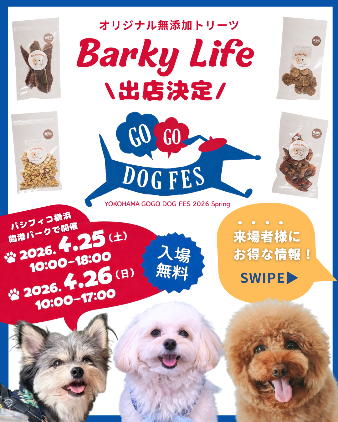 オリジナル無添加ドッグトリーツブランド「Barky Life」を運営する株式会社VisCreation(所在地:東京都品川区南大井6-16-20 品川水神ビル6階、代表者:藤川 進人、URL:https://viscreation.co.jp/)は、2026年4月25日(土)・26日(日)にパシフィコ横浜 臨港パークで開催される『YOKOHAMA GOGO DOG FES 2026 Spring』に出店することをお知らせいたします。