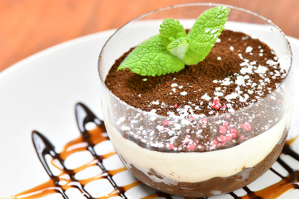 スイーツには、イタリア製本格エスプレッソマシンで抽出したエスプレッソをベースに、白砂糖不使用のマスカルポーネホイップを重ねた「エスプレッソ薫る本格大人ティラミス」が人気です。