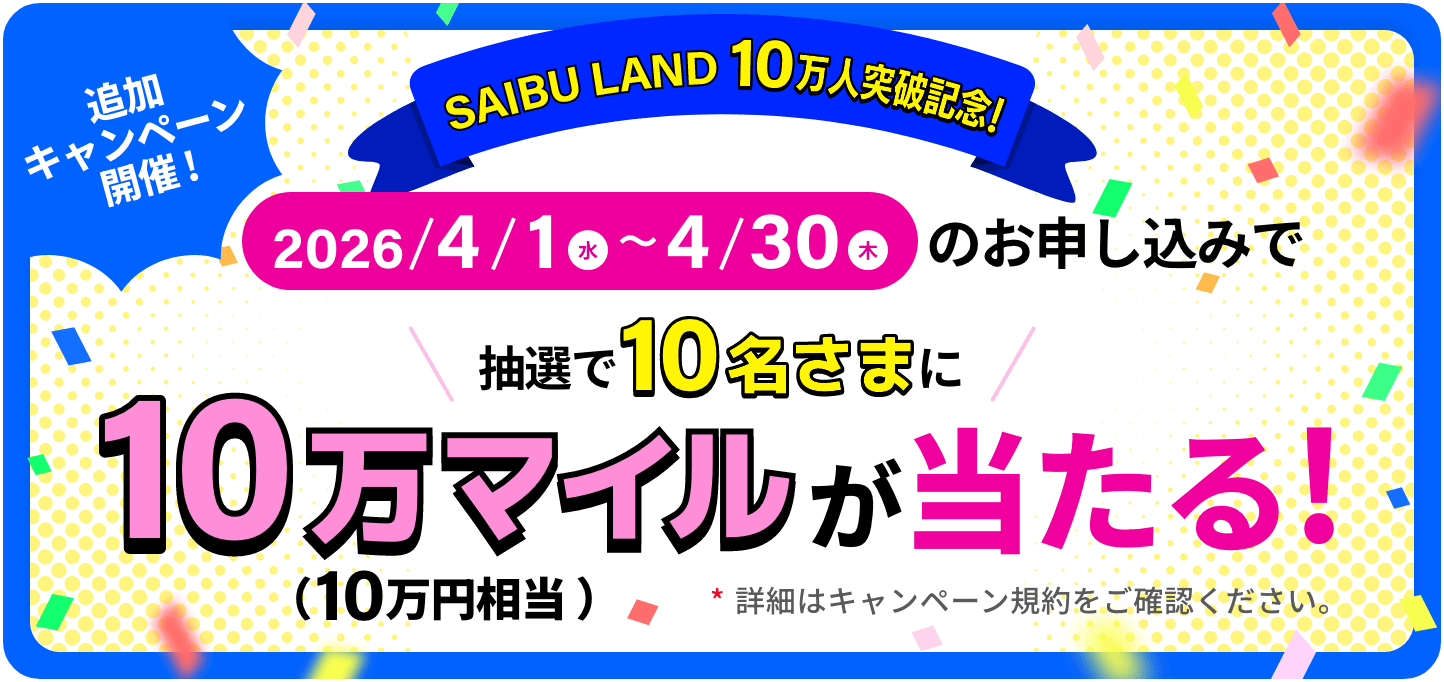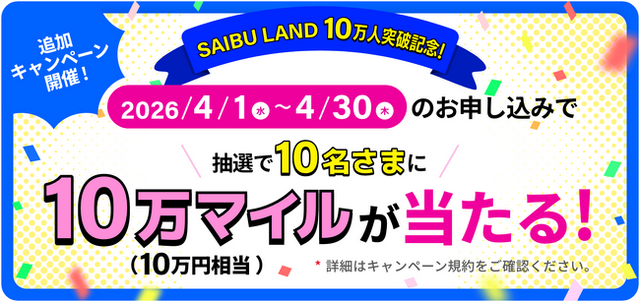 対象者の中から抽選で10名さまに、西部ガスグループの無料会員サービス「SAIBU LAND」(運営:西部ガスホールディングス株式会社)で利用できる10万マイルを進呈します。