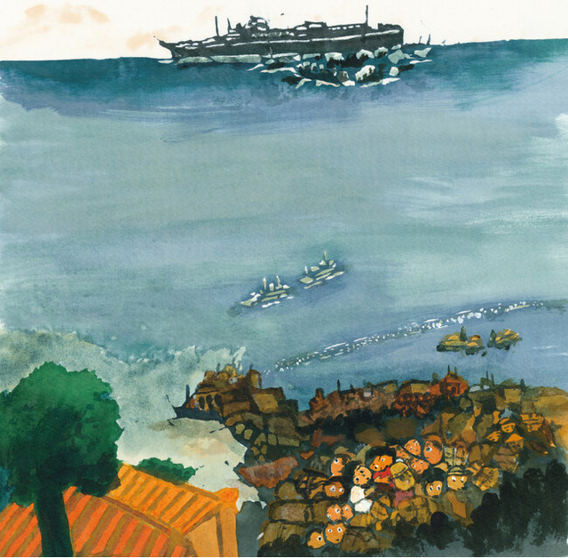 那覇港から小さな船で、沖に停泊する大きな対馬丸に乗り替えるひろ子たち。吊りはしごが下ろされ、ゆれる階段をのぼっていく。(『ガージュー先生』P8-9より)