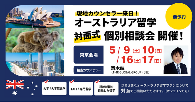 この説明会では、オーストラリア在住のスタッフが来日し、東京にて対面、またはオンラインにて個別相談を実施。将来的な大学進学・留学から永住権取得・現地就職を見据えた留学プランについて、参加者の状況に応じて具体的にご案内いたします。