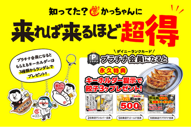 圧倒的なコストパフォーマンスと活気あふれる店内でご好評いただいている「餃子のかっちゃん」。この度、日頃からご愛顧いただいているリピーターのお客様へさらなる還元を目指し、モバイルオーダーシステム「dinii(ダイニー)」を活用した新たなランクカード制度を開始します。 ご来店時のチェックイン回数に応じて「シルバー」「ゴールド」「プラチナ」とランクアップし、達成ごとに超お得な特別クーポンや限定グッズをプレゼントします。[画像1: https://prcdn.freetls.fastly.net/release_image/176111/14/176111-14-374cbeab271721362e13c9d5d0f12a8c-3900x2600.jpg?width=536&quality=85%2C75&format=jpeg&auto=webp&fit=bounds&bg-color=fff ]