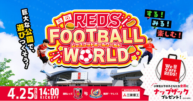 サッカーJ1・浦和レッズは、4月25(土)に埼玉スタジアムで開催するホームゲーム(14時キックオフ 横浜F・マリノス戦【MATCH PARTNER 三菱重工】)にて、スタジアムを”サッカーのテーマパーク”として楽しめる特別イベント「REDS FOOTBALL WORLD」を開催します。子どもから大人まで気軽に参加できるフットボールコンテンツが充実し、スタジアム全体で、”ボールを蹴る楽しさ”を体感できる一日に。