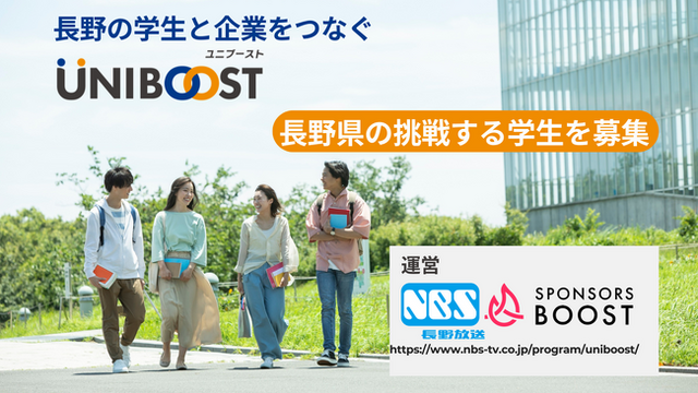 株式会社スポンサーズブースト(本社:東京都渋谷区、以下当社)は、株式会社長野放送(本社:長野県長野市、以下NBS)と連携し、長野県内の学生団体と企業をスポンサーという形でつなぐプラットフォーム「UNIBOOST」を開始します。